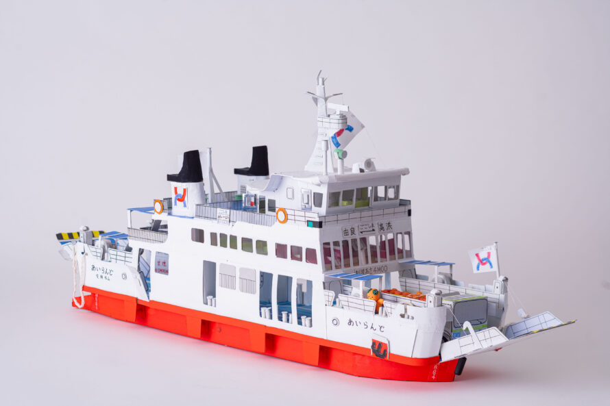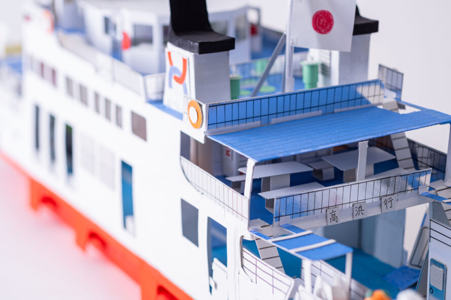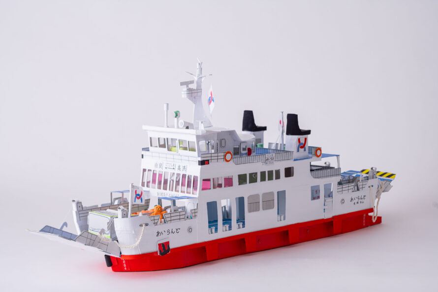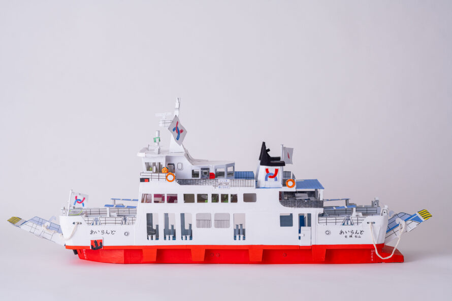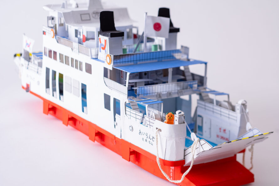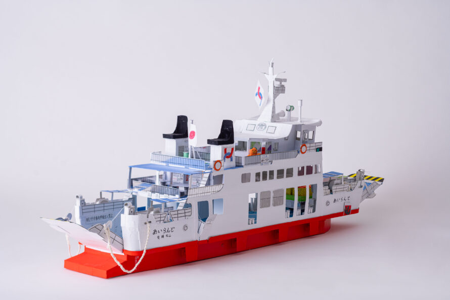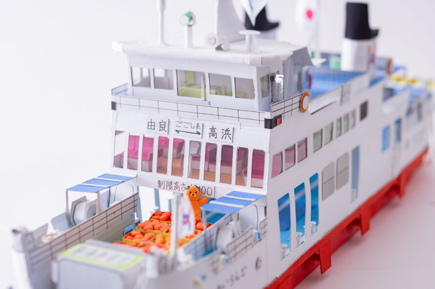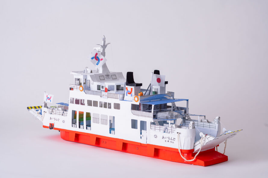 かつて松山市の興居島にて活躍していたフェリーあいらんどを制作しました。内装の椅子や窓、テーブル、自動販売機もこだわって作りました。素材はお菓子の空き箱やボール紙をおもに使用しました。ごごしまみかんの出荷に合わせて、トラックに山盛りのみかんをコンテナに積んでいます。実際は、みきゃんのぬいぐるみが展望室内に置いているのですが、作品では外に出て手を振っています。難しかった所は、特徴的な煙突の形や船体の強度などバランスをとりながら制作しました。