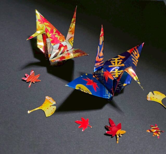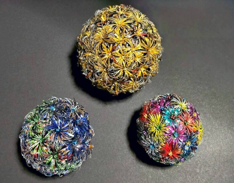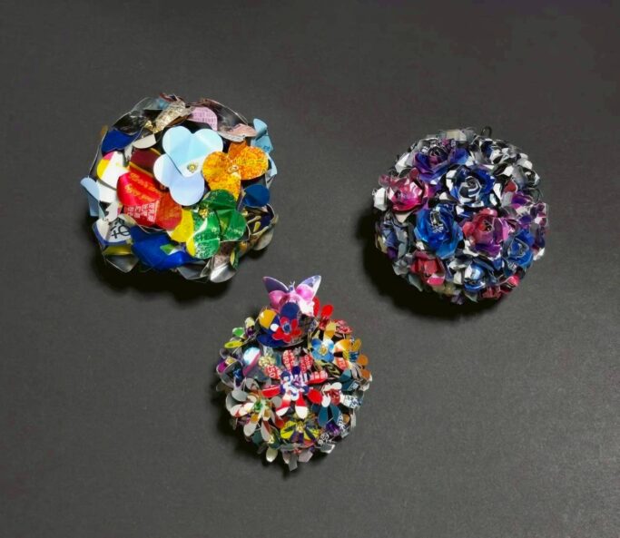 ジュースやビールのアルミ缶を使ってアートを作っています。アルミ缶のもつポップな模様を活かした、細かなパーツを組み合わせて作るフラワーボールがメイン作品です。また、アルミ缶を使って折り鶴、カブトムシ、クワガタなども製作しています。