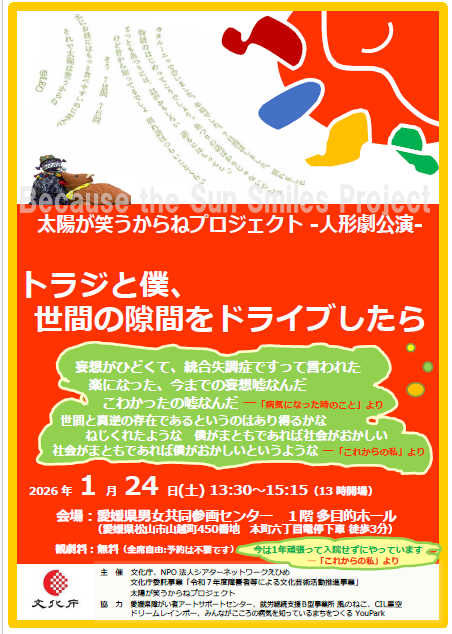 2026年1月24日(土)、愛媛県男女共同参画センターにて、精神疾患・精神障がいと向き合いながら生きる主人公の旅を描いた人形劇「トラジと僕、世間の隙間をドライブしたら」を2026年1月24日(土)に上演します。