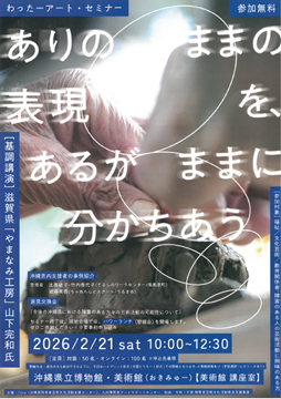 プログラム前半では、九州ブロックの広域センターとして先駆的な実践を重ねている「九州障害者アートサポートセンター」の樋口龍二氏を聞き手に迎え、沖縄県内の福祉事業所による特色ある事例を紹介。現場の熱量や工夫を掘り下げます。後半は、滋賀県「山なみ工房」の山下完和氏による基調講演を行い、表現の本質や支援の在り方について伺います。最後には意見交換会を行い、県内外の知見を交えて沖縄における芸術活動の可能性を語り合います。